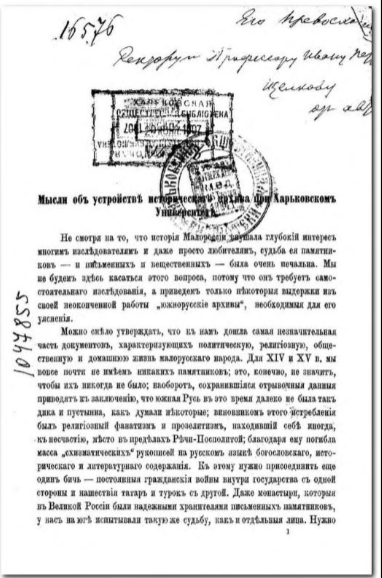 «Вступивши в 1893 р. до складу правління Харківської громадської бібліотеки… Ви спрямували турботи Ваші до примноження книжкового багатства бібліотеки, залучаючи пожертви книжками, грошима, привертаючи до справи, Вам дорогій, роблячи її близкою і для інших, читаючи публічні лекції на користь бібліотеки. Ваша праця увінчалася успіхом: Харківська громадська бібліотека стала великим огнищем просвіти. Книжкове багатство бібліотеки, завдяки співчуттю суспільства і дружній праці, керівником якої Ви були, швидко примножилося, і воно, це багатство, настійно потребувало відповідного приміщення. Думка про влаштування власного будинку для Бібліотеки вже давно панувала у її працівників, але здавалася мрією. Ви наполегливо говорили, писали, що ця думка має бути здійснена, і зробили мрію дійсністю. Ви клопотали перед Університетським начальством і Міністерством Народної Освіти про придбання місця для спорудження будівлі громадської бібліотеки, Ви залучали пожертвування для будівлі; завдяки Вашому клопотанню було отримано за Височайшим повелінням субсидiю в розмiрi 45,000 крб. Зібрані Вашою невтомною енергією кошти дали можливість приступити до зведення. Із цією метою було утворено особливу комісію, і в заняттях її Ви прийняли найгарячішу участь, Ви щодня відвідували роботи з будівництва споруди, з любов’ю заглиблюючись в усі будівельні деталі, легко переносячи важкий і відповідальний тягар незліченних турбот з будівництва.