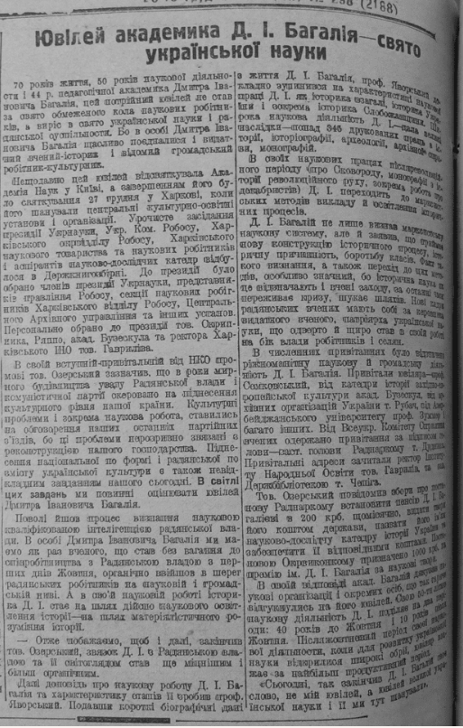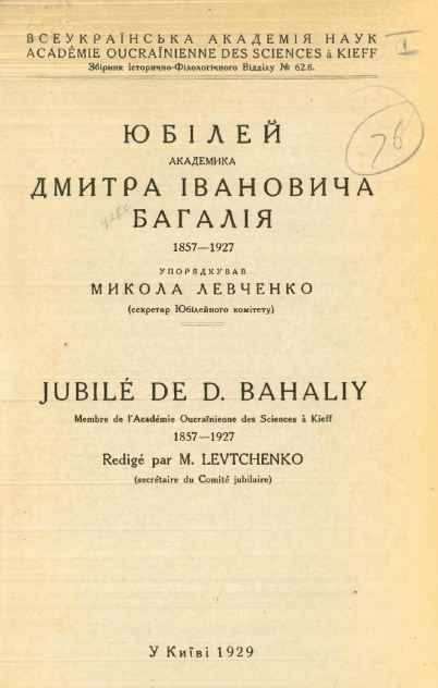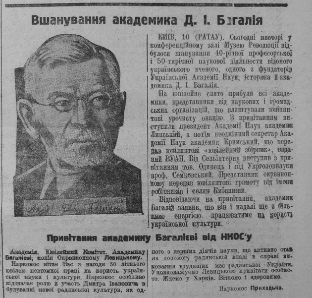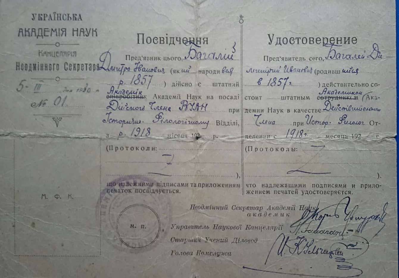 Д. І. Багалій на запрошення В. І. Вернадського і гетьманського уряду взяв активну участь у створенні Української академії наук (УАН, 1918) як перший віцепрезидент, голова історико-філологічного відділення.